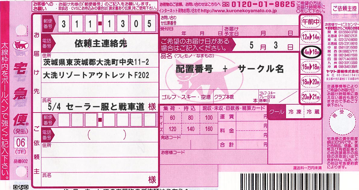 荷物は5月3日(火曜)までに配達店に到着するよう余裕をもって配送をお願いします。